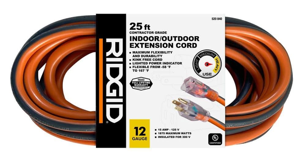 RIDGID . 12/3 Heavy Duty Indoor and Outdoor Extension Cord, 25 Ft, Orange-Grey