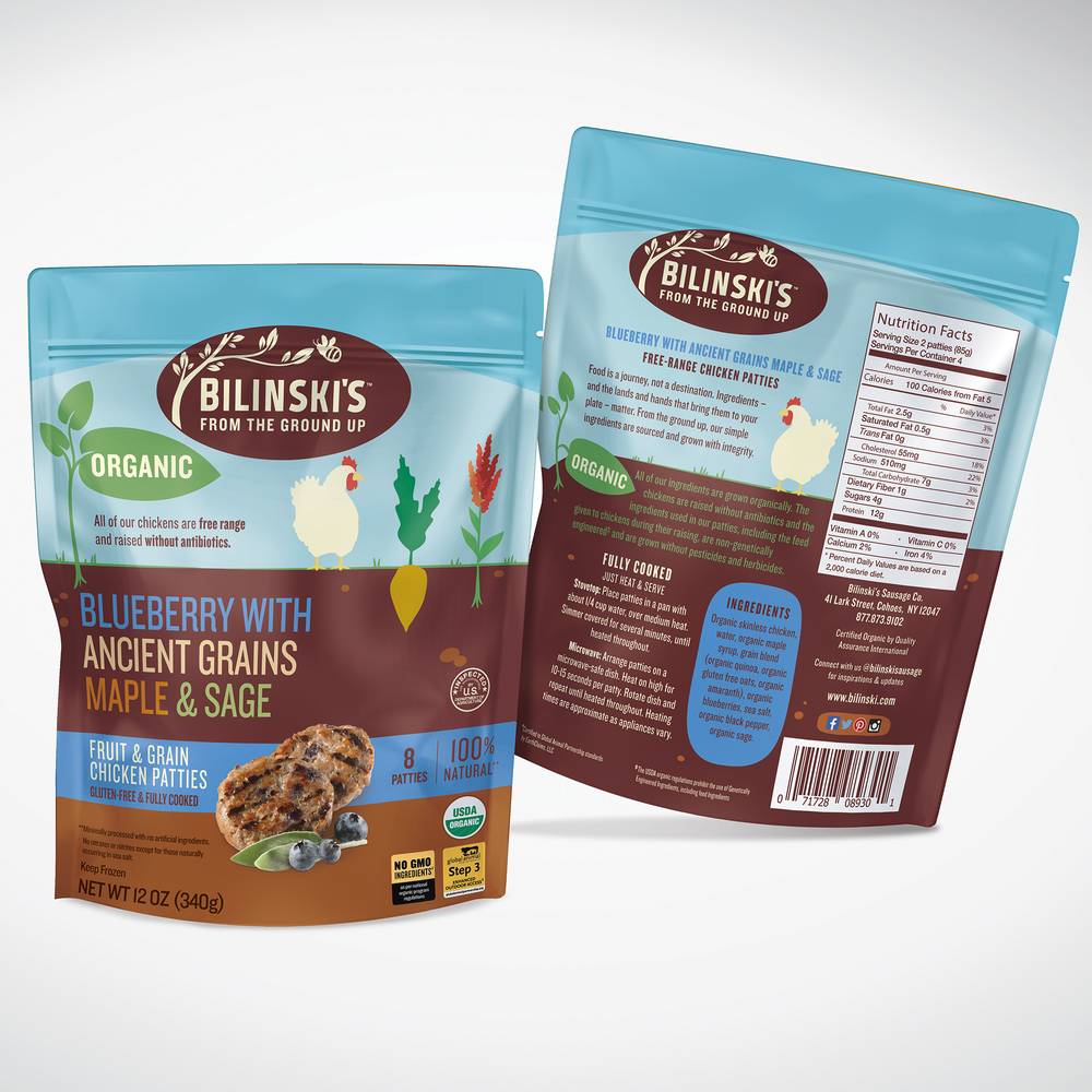 Bilinski's Frozen Organic Blueberry With Ancient Grains Maple & Sage Chicken Patties (12 oz, 8 ct)