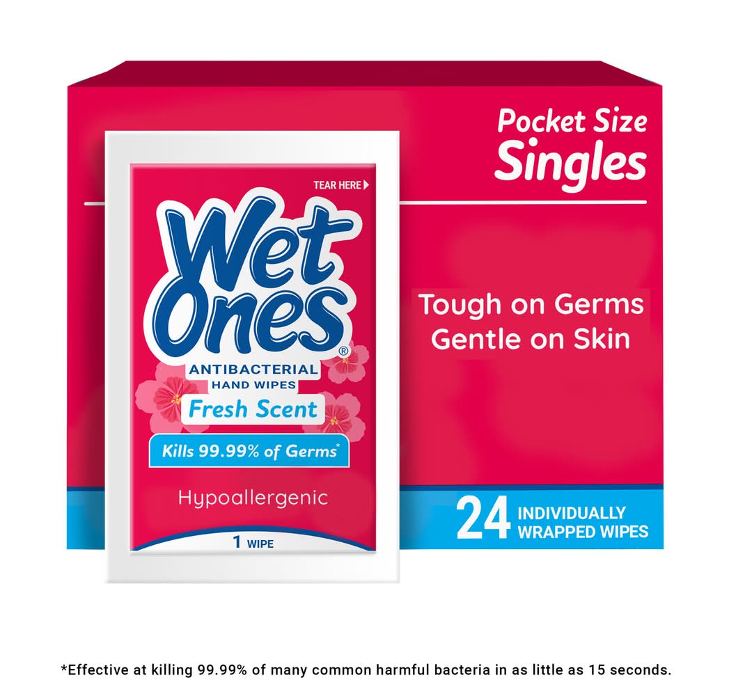Wet Ones Pocket Size Singles Hypoallergenic Antibacterial Hand Wipes, Fresh (6.4 oz, 24 ct)