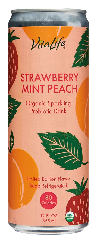 VitaLife Limited Edition Organic Sparkling Probiotic Drink, Strawberry Mint Peach (12 fl oz)