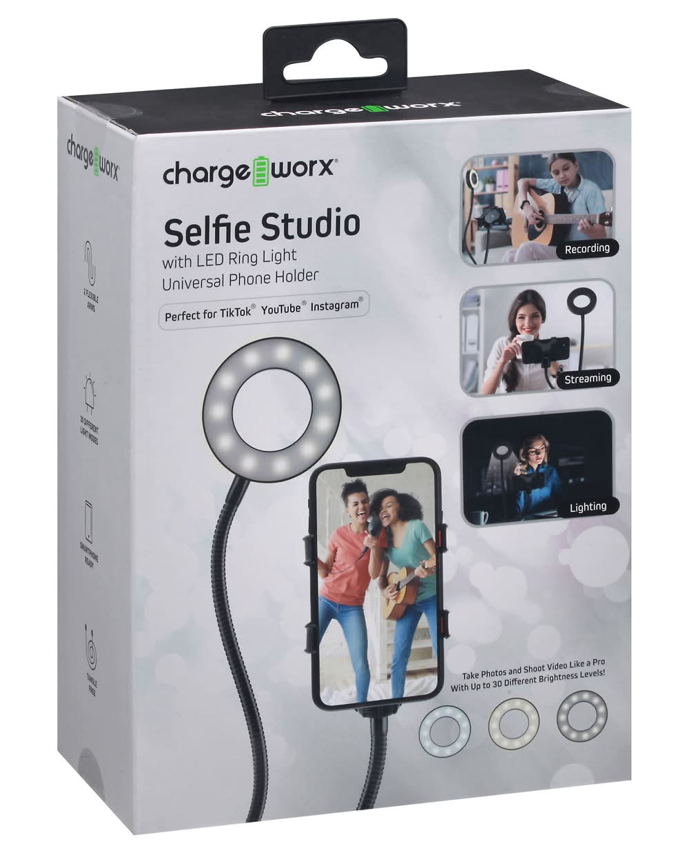 Chargeworx With Led Ring Light Selfie Studio Universal Phone Holder, Black