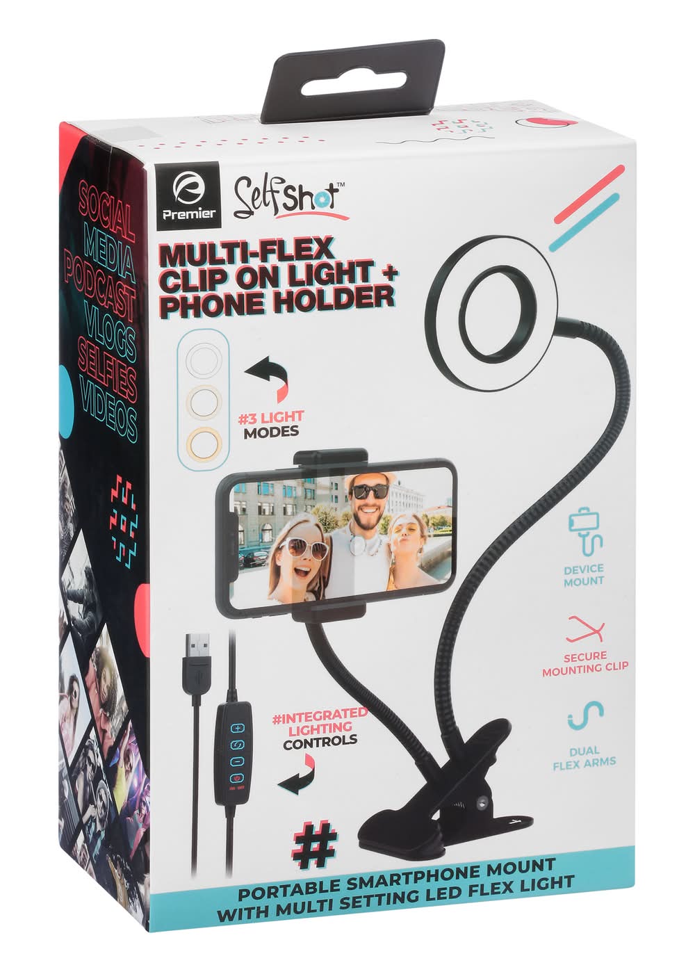 Premier Selfshot Multi-Flex Clip on Light + Phone Holder, Black