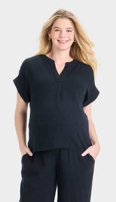 Isabel Maternity by Ingrid & Isabel Short Sleeve V-Neck Maternity Gauze Blouse, Women, M, Black