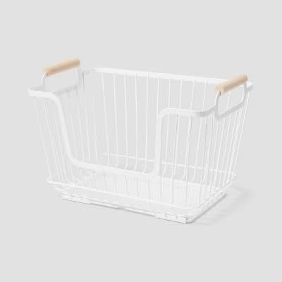 Brightroom Metal Stackable Wire Pantry Basket With Rubber Wood Handle, 9" x 13.5", White