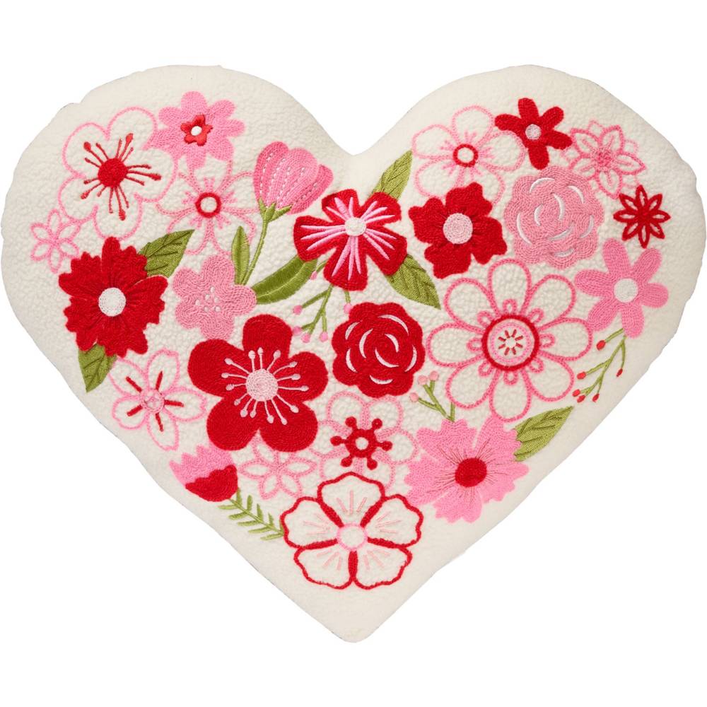 Embroidered Flowers Heart Shaped Pillow, 17x14 in, Red-Pink