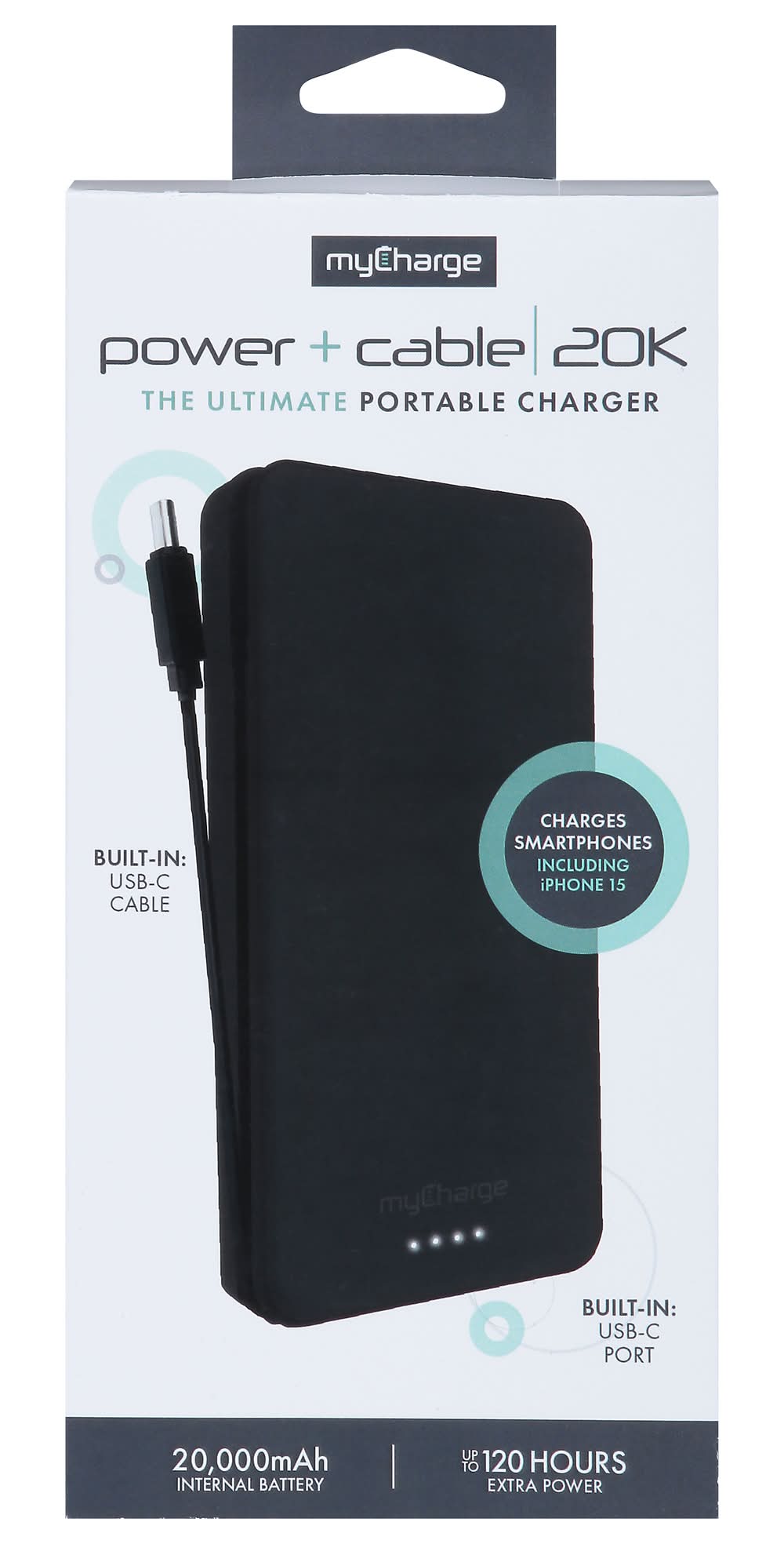 My Charge Portable Charger With Built-In Cable, 20000mAh