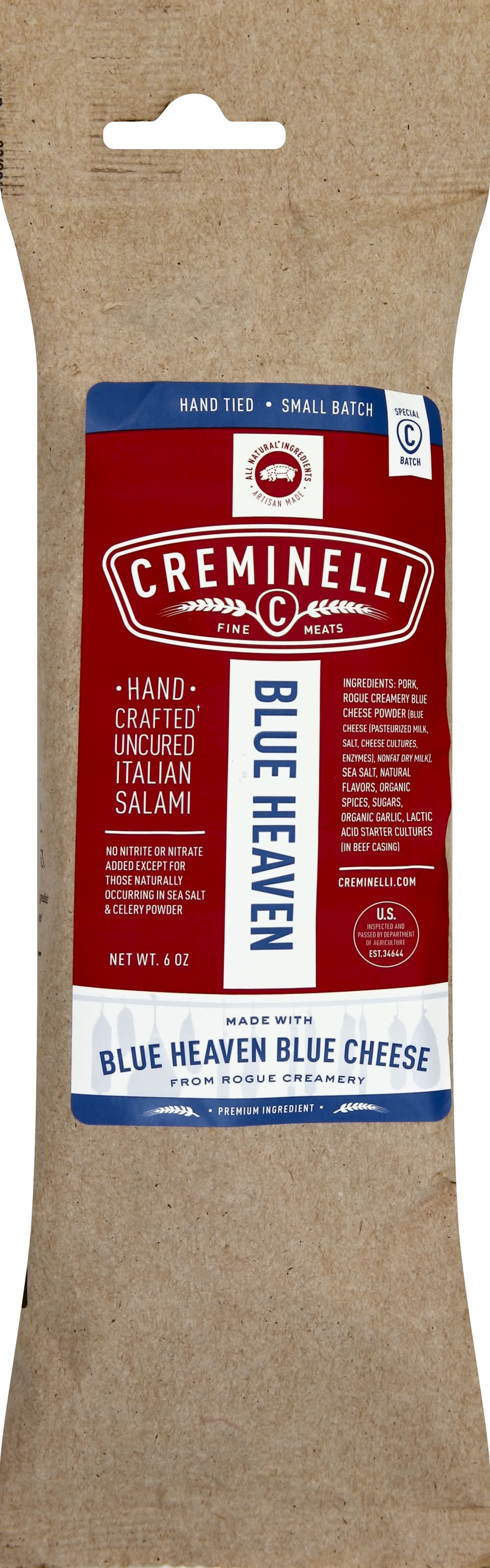 Creminelli Fine Meats Blue Heaven Salami, Blue Cheese - Rogue Creamery (6 oz)