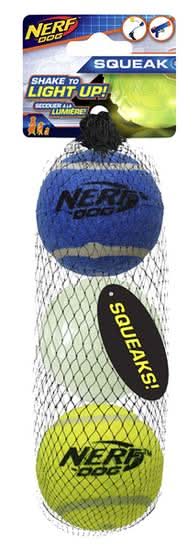Nerf Dog 2.5 Inch Squeak Tennis Ball and 2.5 Inch Translucent Tpr Lightning Led Glow Ball 3 Pk