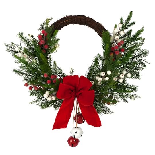 Ashland Christmas Pine Bow & Bell Half Wreath, 24 x 3.5 x 24 in, Red-Green